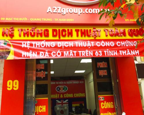 + Địa chỉ văn phòng cung cấp dịch vụ phiên dịch, dịch thuật rộng khắp cả nước, rất thuận tiện khi khách hàng sử dụng dịch vụ. Tùy từng nội dung, tính chất của buổi phiên dịch, Công ty dịch thuật A2Z sẽ có sự lựa chọn phiên dịch viên phù hợp nhất, đáp ứng yêu cầu khắt khe nhất của quý khách.