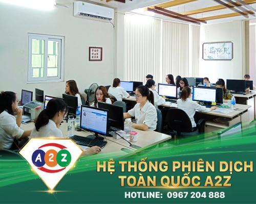 Là một trong những công ty dịch thuật, phiên dịch chuyên nghiệp hàng đầu tại VN. Với khả năng dịch nhiều thứ tiếng chúng tôi luôn tự tin dịch cho quý khách với độ chính xác cao trong khoảng thời gian nhanh nhất. Trong lĩnh vực dịch thuật với đội ngũ dịch giả viên đông đảo và nhiều kinh nghiệm trong nghề luôn đem đến dịch vụ tốt nhất làm vừa lòng những khách hàng khó tính nhất. Công ty có đội ngũ đông đảo cán bộ có trình độ đại học trở lên, có chuyên môn sâu về chuyên ngành, bao gồm toàn thể nhân viên và cộng tác viên đông đảo có năng lực, có chuyên môn, đầy nhiệt huyết và luôn mong muốn thực hiện công việc với lòng yêu nghề, chất lượng và hiệu quả cao nhất. Hệ thống thông tin liên lạc được thiết lập bằng nền tảng công nghệ hiện đại đáp ứng nhanh nhất mọi yêu cầu của khách hàng trên phạm vi toàn cầu. Chúng tôi nhận dịch thuật, Phiên dịch... nhiều ngôn ngữ. Từ các ngôn ngữ thông dụng như Tiếng Anh, Pháp, Nhật, Nga, Trung, Đức, Hàn, Italia, Tây Ban Nha, Bồ Đào Nha…đến các ngôn ngữ ít sử dụng tại Việt Nam như Arập, Ba Lan, Phần Lan, Thái Lan, Hà Lan, Hungari, Rumani, Ucraina, Séc, Slovakia, La Tinh, Thuỵ Điển, My-an-mar, Đan Mạch, Lào, Campuchia, Khơ-me, Inđônêxia, Malayxia, Brunei, Iran,… Chúng tôi hoạt động dựa trên nền tảng đạo đức nghề nghiệp, sự hài lòng của khách hàng là mục tiêu mà tất cả những ai làm việc tại dịch thuật A2Z luôn hướng tới, với tinh thần và trách nhiệm cao trong công việc chúng tôi cam kết với khách hàng cho ra đời những tác phẩm dịch thuật chất lượng nhất với giá cả cạnh tranh nhất. ♦ Đội ngũ biên phiên dịch A2Z chuyên nghiệp ♦ Quy trình đảm bảo chất lượng dịch thuật ♦ Hoàn thành đúng thời hạn ♦ Giá dịch cạnh tranh ♦ Dịch vụ khách hàng chuyên nghiệp
